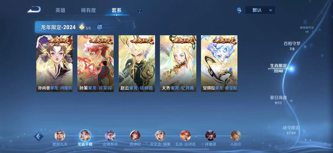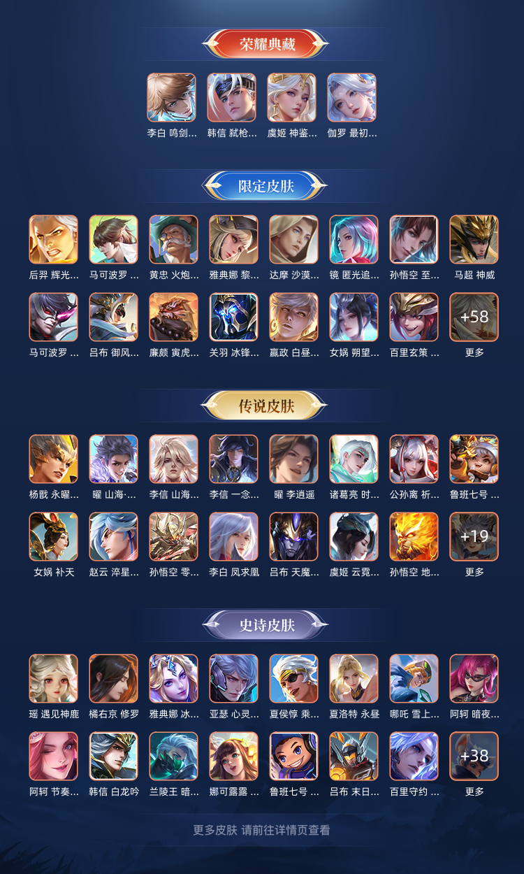 典藏4,无双8,珍品3,传说72。龙年限定全套。诸葛亮天机白泽,甄姬雪境奇遇,公孙离离恨烟。妲己九尾