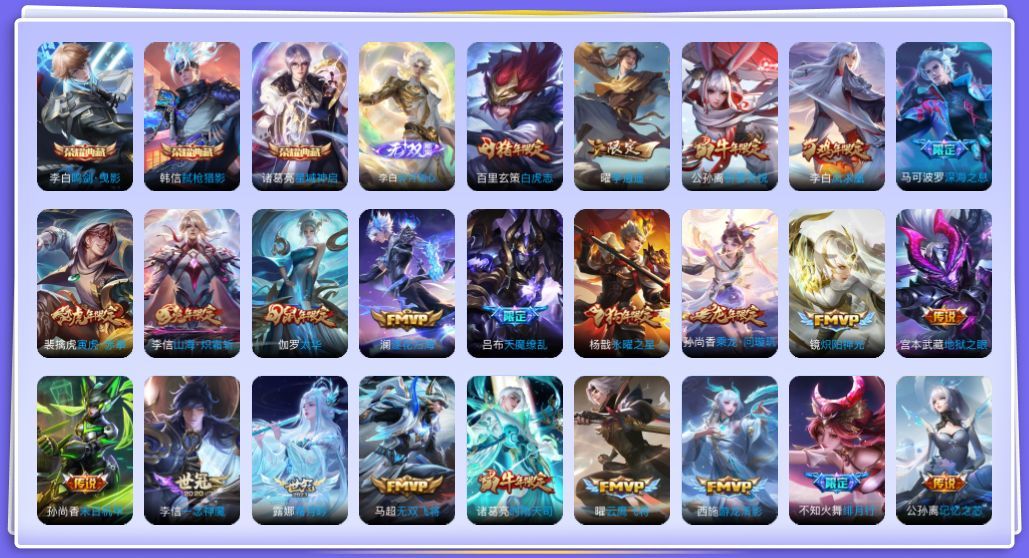 装备描述:V10 英雄数: 126 皮肤数: 421 荣耀水晶: 鸣剑·曳影,星域神启,弑枪猎影 无双皮: 碎月剑心 传说皮: 冠军飞将,云鹰飞将,猫影幻舞,久胜战神,炽阳神光,一念神魔,末日机甲-孙尚香,仲夏夜之梦,零号·赤焰,地狱之眼,胖达荣荣,李逍遥,乞巧织情,时之恋人-刘备,游龙清影,淬星耀世,无双飞将,山海·炽霜斩,记忆之芯,惊梅引,霜月吟,澜逐花归海,艾琳觅芳踪,乘龙·问璇玑 限定皮: 冰锋战神,遇见飞天,李小龙,祈雪灵祝,游园惊梦,梁祝,云端筑梦师,时雨天司,白鹤梁神女,烈魂,辉光之辰,白晶晶,天狼溯光者,天魔缭乱,神威,蜜橘之夏,永曜之星,时之彼端,奇迹圣诞,飞衡,太华,青春决赛季,冰霜恋舞曲,天狼运算者,逐梦之星,天狼绘梦者,凤求凰,白虎志,青龙志,瑞麟志,玄武志,朱雀志,凤凰于飞,梅西,如梦令-嫦娥,至尊宝,一生所爱,如梦令-后羿,大圣娶亲,默契交锋-花木兰,霸王别姬-虞姬,高山流水,孙行者,猪悟能,寅虎·赤拳,启示之音,深海之息,五谷丰年,绯月行,诗剑行,山海·玄木吟