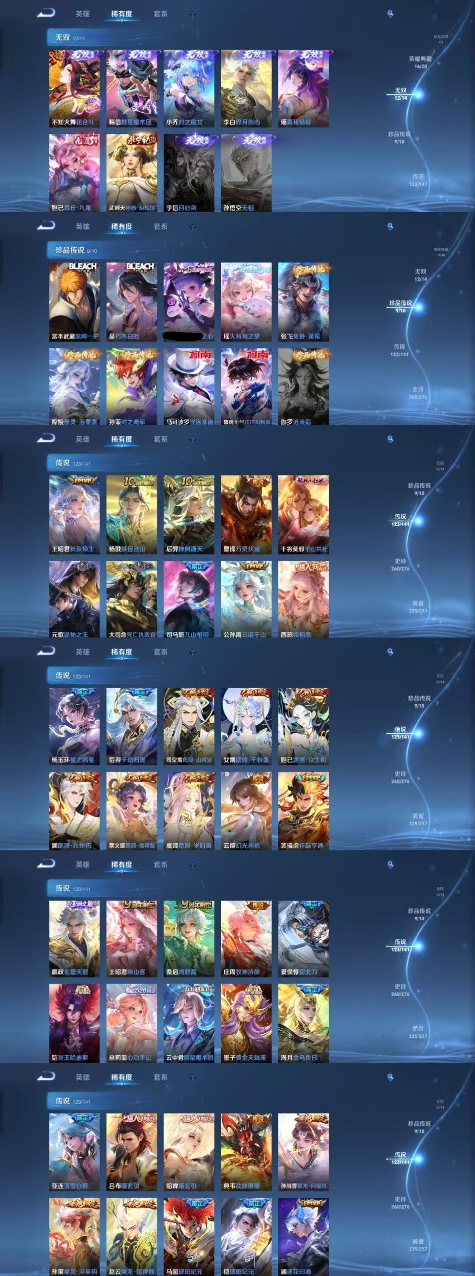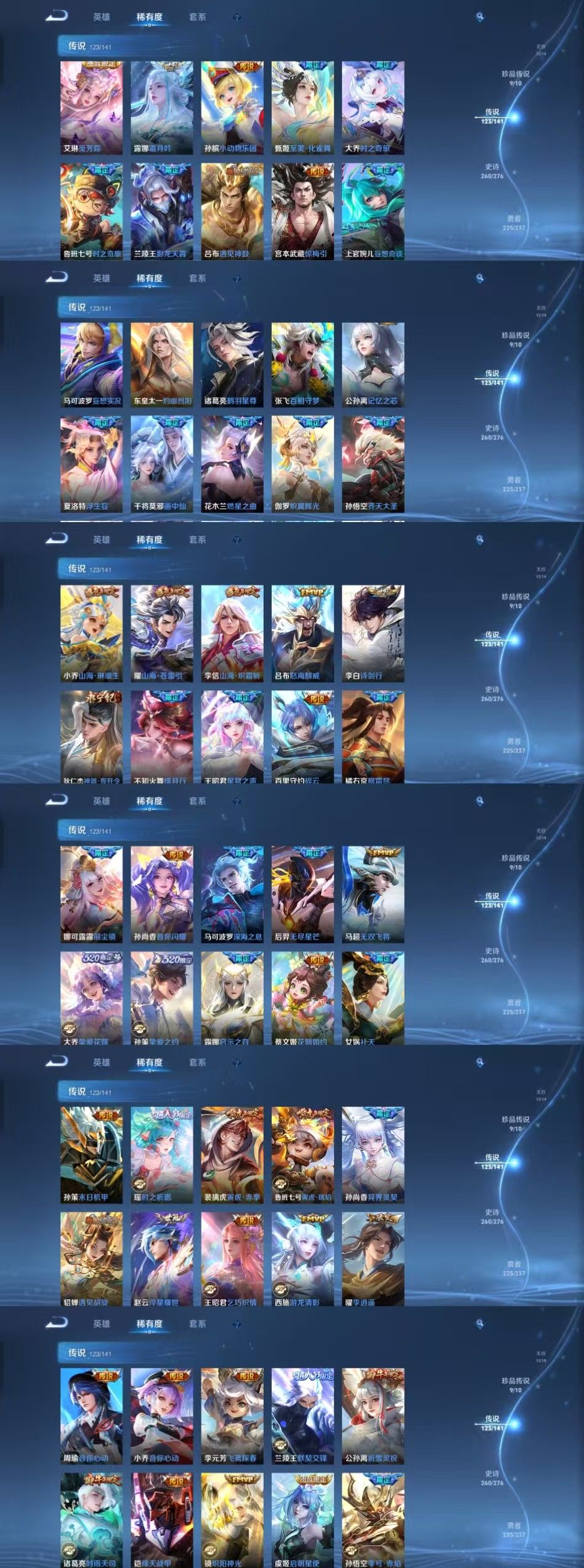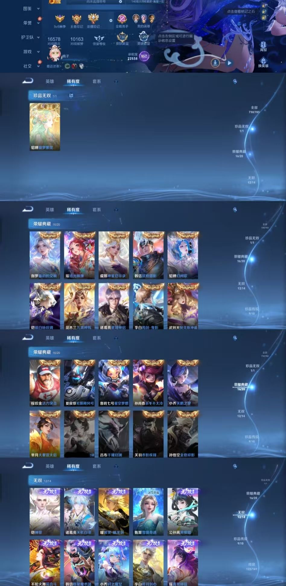 限制: 租号2次及以上 | 撤单率<49%才可租用此帐号装备描述: 该号英雄129个皮肤730个,珍品无双1个,典藏17个,无双12个,珍品传说9个,星传说13个,传说123个,史诗260个,祝您游戏愉快~