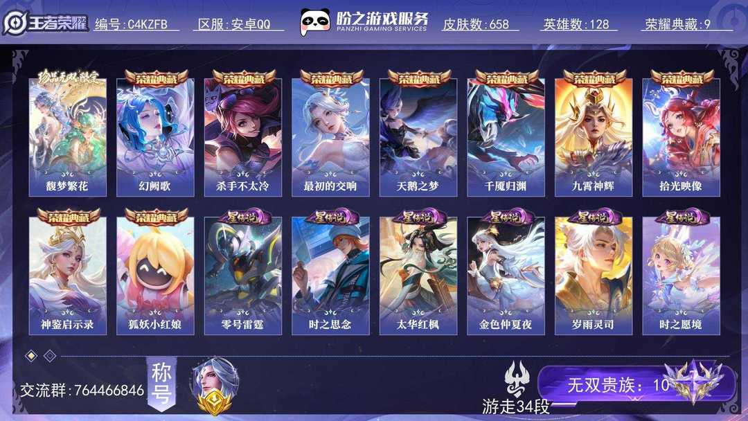 装备描述:【荣耀皮肤】 9 貂蝉_幻阙歌、孙尚香_杀手不太冷、伽罗_最初的交响、小乔_天鹅之梦、吕布_千魇归渊、花木兰_九霄神辉、瑶_拾光映像、虞姬_神鉴启示录、小兵狐妖小红娘 【珍品无双】 1 貂蝉_馥梦繁花 【无双皮肤】 12 瑶_真我赫兹、公孙离_离恨烟、小乔_时之魔女、诸葛亮_天机白泽、铠_神罪、李白_碎月剑心、妲己_青丘九尾、不知火舞_花合斗、甄姬_雪境奇遇、曜_器灵螭龙剑、李信_问心剑、武则天_神器明辉仪 【珍品传说】 10 伽罗_沧流箭、宫本武藏_黑崎一护、安琪拉_酷洛米之心、瑶_大耳狗之梦、暃_朽木白哉、张飞_兔狲蓬尾、鲁班七号_江户川柯南、嫦娥_器灵落星盏、马可波罗_怪盗基德、孙策_时之奇旅 喜欢本账号请点 ☆收藏☆ 方便下次租用,谢谢光临惠顾! 禁止利用账号进行开挂、使用辅助违规软件诈骗等违规操作。