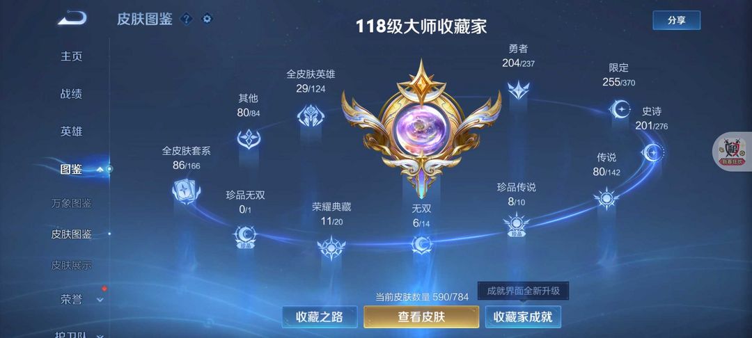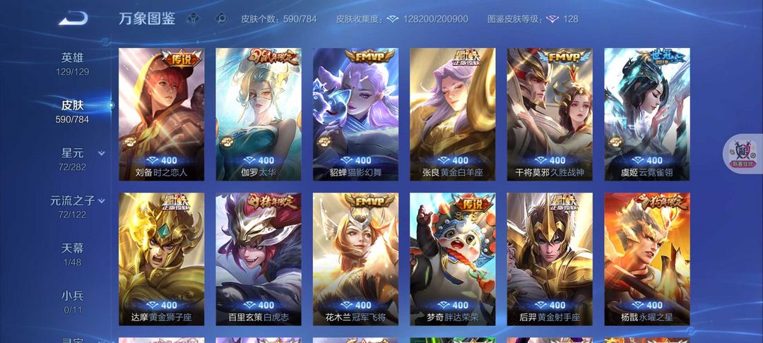 装备描述:590皮肤12典藏6无双❤️80传说8珍品❤️凯神罪死神联动天机白泽离烟恨花合斗螭龙剑真我赫兹❤️满s蛇年