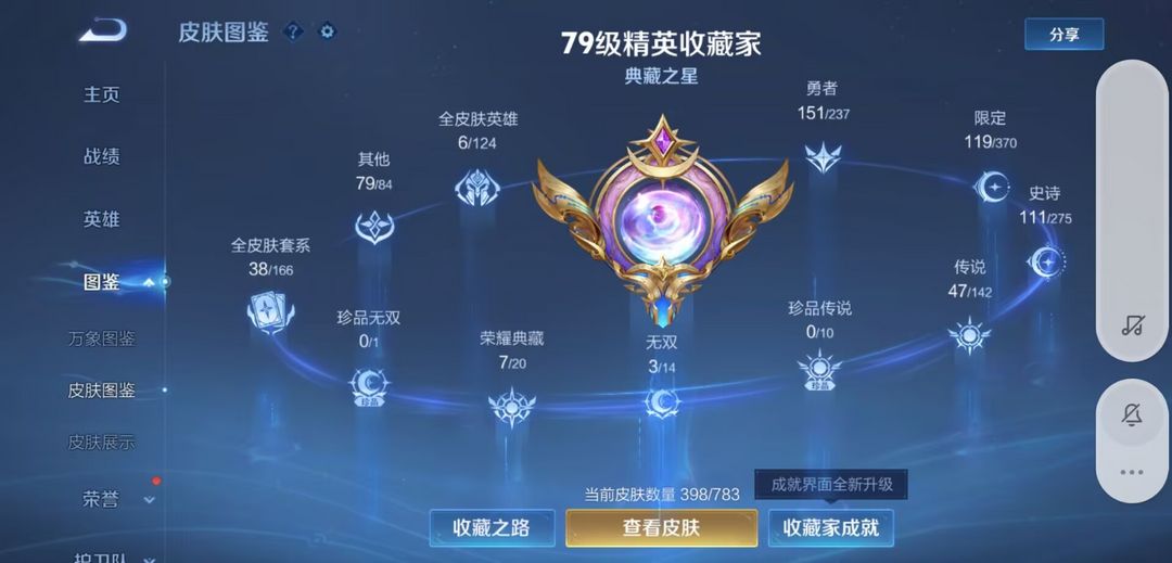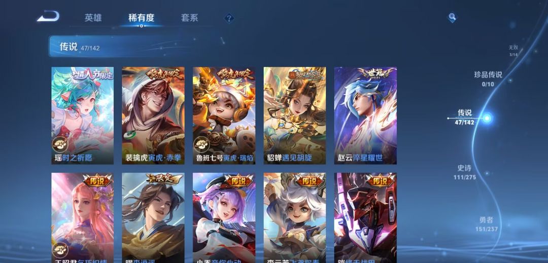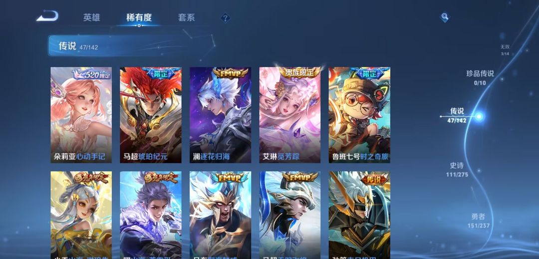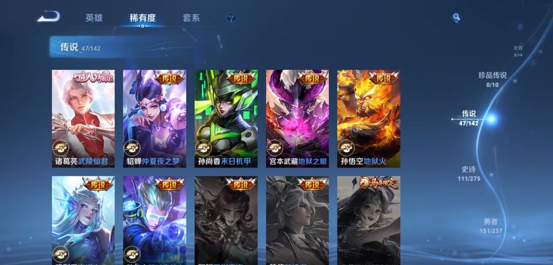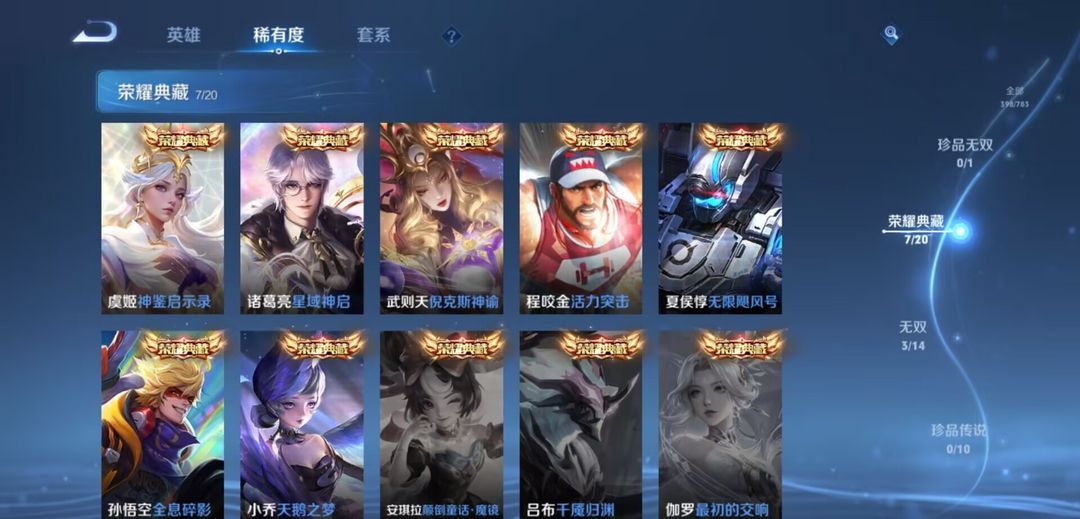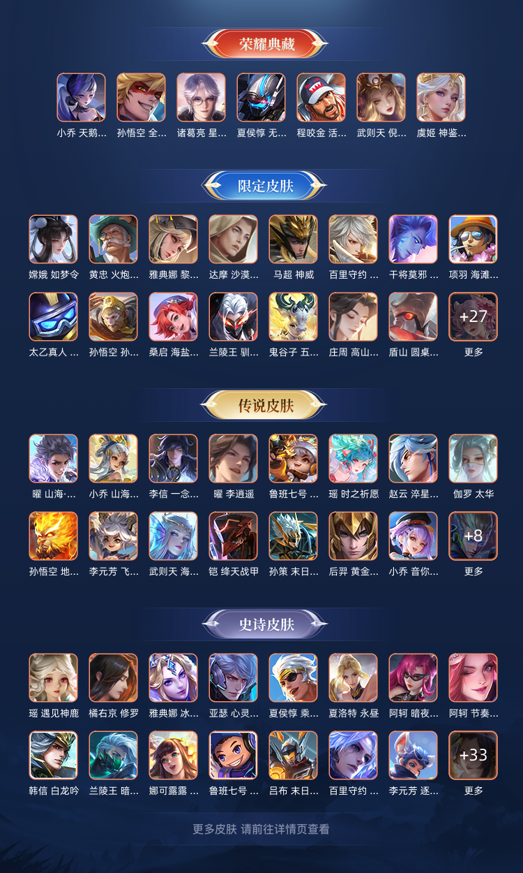 限制: 撤单率<50%才可租用此帐号装备描述:贵族等级:V10,可共享皮肤 皮肤总数:398/783,全英雄 129/129 稀有皮肤: 荣耀典藏 ×7:虞姬神鉴启示录、诸葛亮星域神启、武则天倪克斯神谕、程咬金活力突击、夏侯惇无限飓风号、孙悟空全息碎影、小乔天鹅之梦 无双 ×3:孙悟空无相、甄姬雪境奇遇、李白碎月剑心 传说 ×47:含马年限定神骥全皮、FMVP / 世冠 / 情人节 / 年限等限定传说 收藏等级:79 级精英收藏家,万象图鉴 102 级