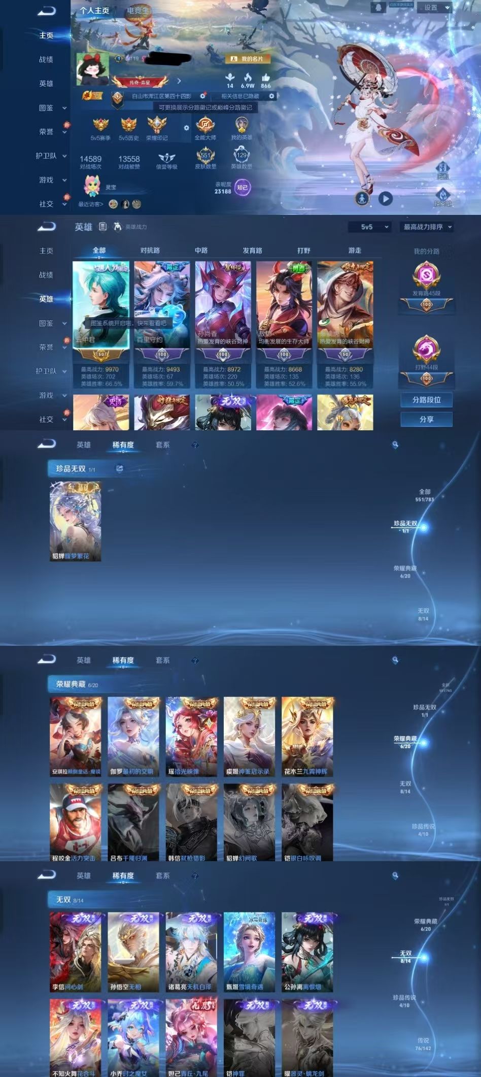 限制: 租号2次及以上 | 撤单率<49%才可租用此帐号装备描述:该号英雄129个皮肤551个,珍品无双1个,典藏7个,无双8个,珍品传说4个,星传说7个,传说76个,史诗175个,祝你游戏愉快~