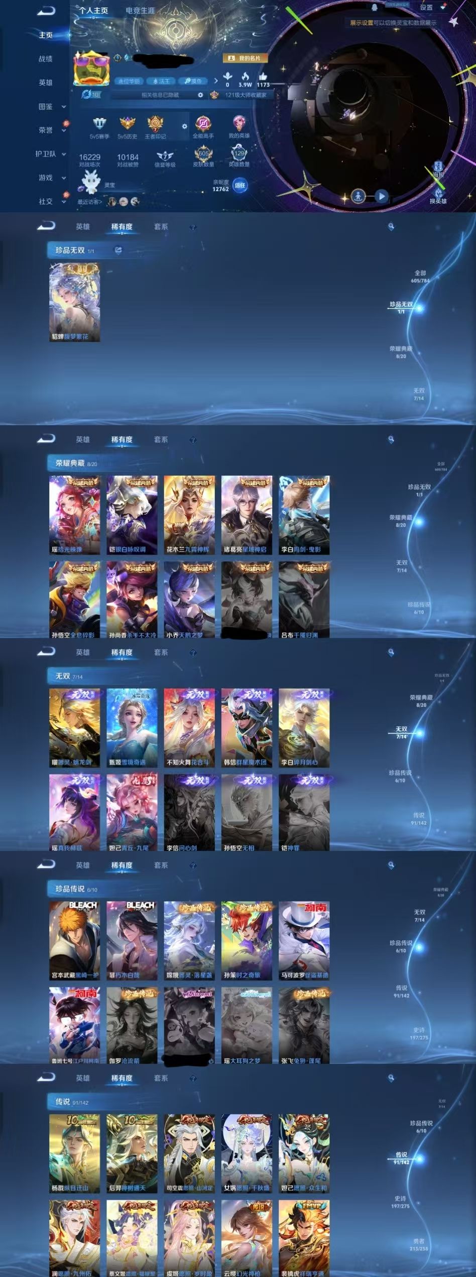 限制: 租号2次及以上 | 撤单率<49%才可租用此帐号装备描述:时间到了还登录白玩或者顶号全部改密拉黑处理永不解除,顶号机器会秒禁玩改密,顶号不仅拉黑还没得玩,赚三两块不容易,请理解谢谢。 ❤❤❤❤❤❤❤❤❤❤❤❤❤❤❤❤❤❤❤ 请勿开挂,挂机,送头,骂人,撤单后游戏等如有违规永久拉黑永不解除。 重置二级密码不要费劲了,号主每天都会上号查看,多行不义必自毙,人在做天在看,多做好事多自律,少做缺德事。 该号英雄129个皮肤605个,珍品无双1个,典藏8个,无双7个,珍品传说6个,星传说5个,传说91个,史诗197个,祝你游戏愉快~