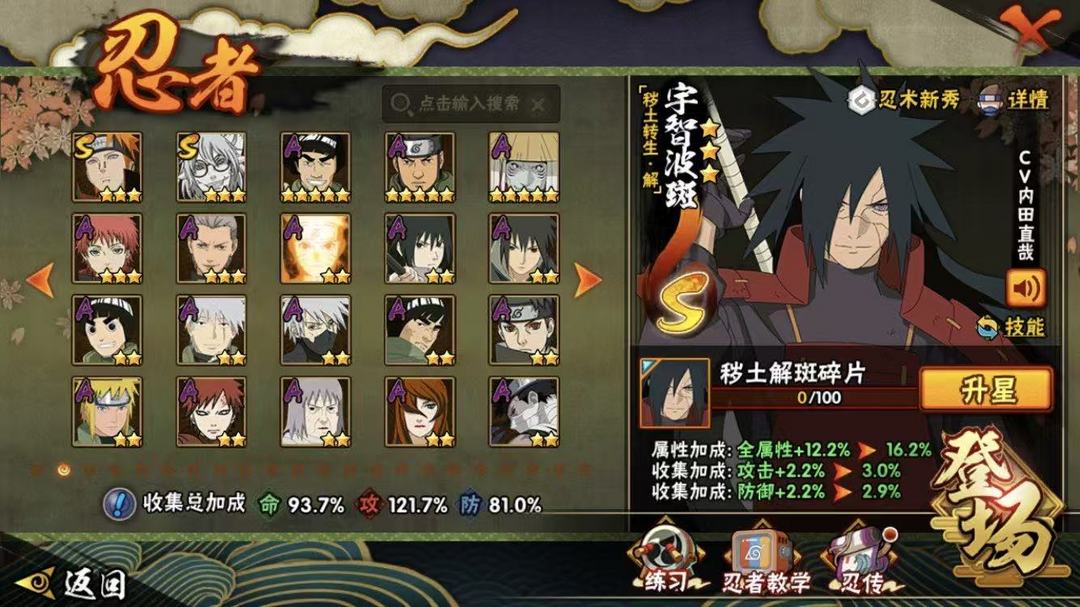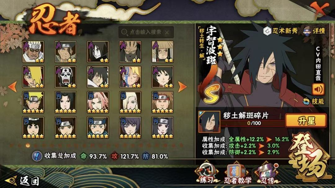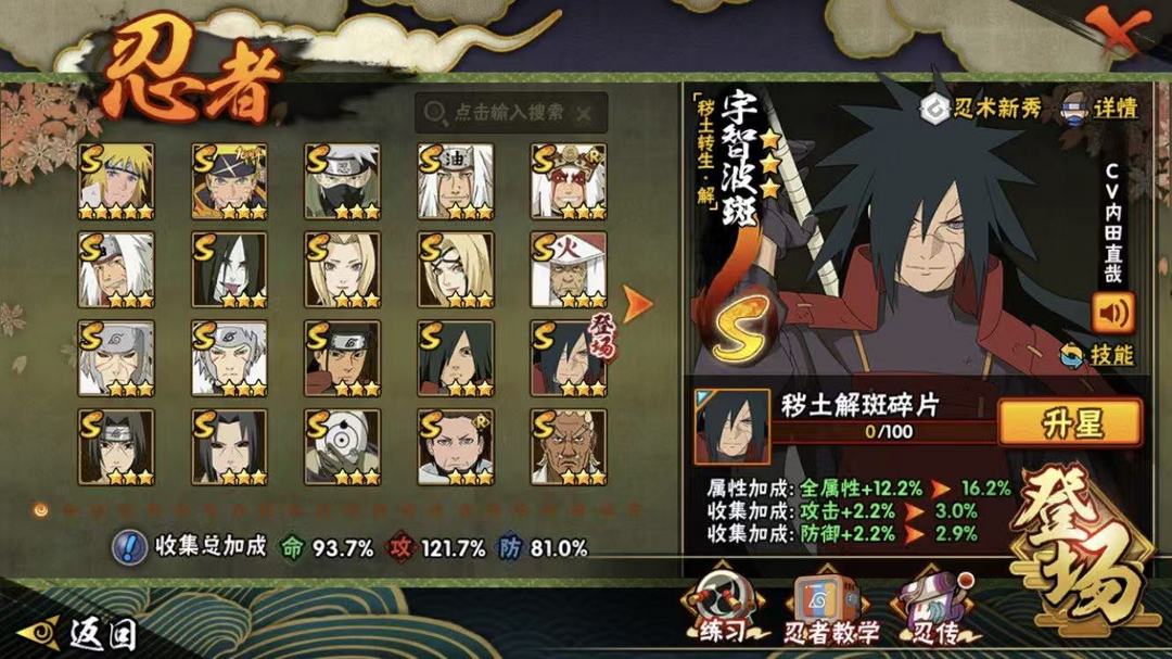 装备描述:22S❤️秽土解斑❤️须佐卡卡西❤️暴怒带土❤️白面积❤️秽土鼬❤️初代二代