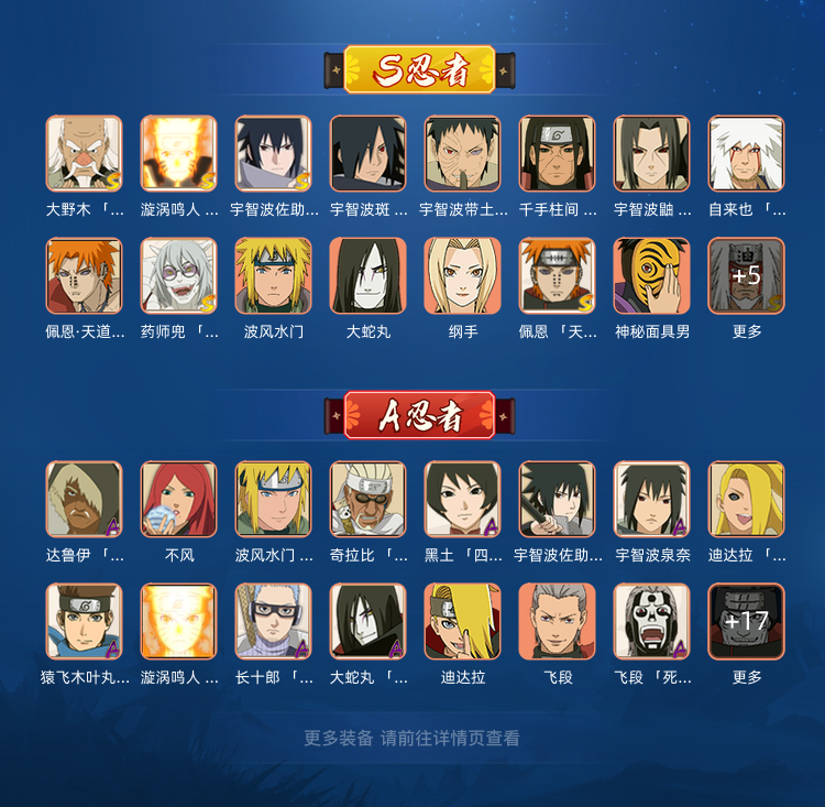 装备描述:31S52A黄猿永恒佐助忍战春野樱天道超死门凯白面具男秽土长门