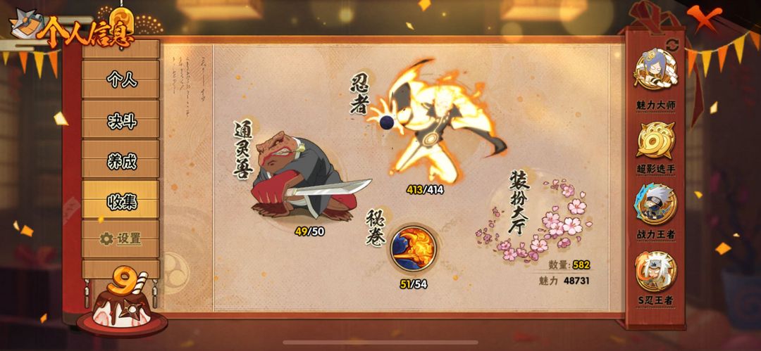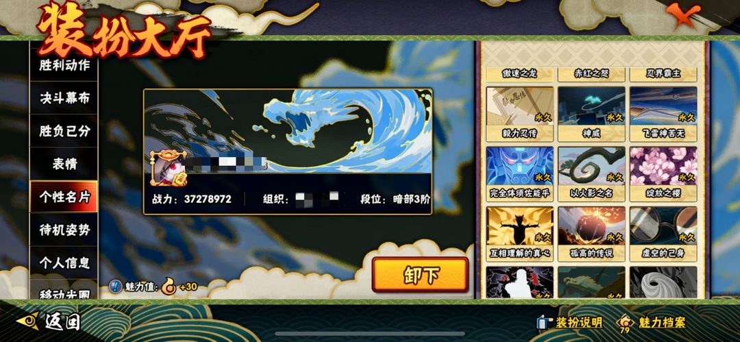 仙人巳月全套✨全忍者413✨侠隐佐助全套✨五影斑已秒✨79级魅力3700W战力✨全通灵全时装顶配苹果