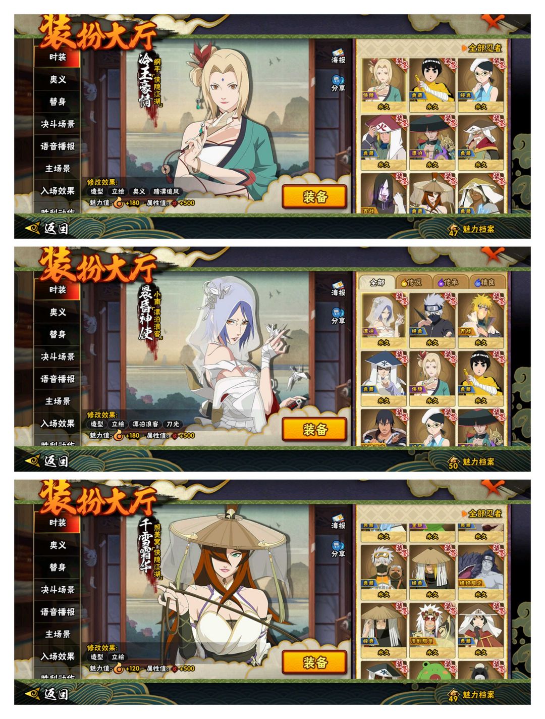 装备描述:55S 105A 410忍者 黑绝 天道超 侠隐佐助 九喇嘛水门 须佐卡卡西 飞段晓创生 侠隐兜 大筒木舍人传说三忍自来也 漂泊带土 绯流琥蝎 宇智波止水「新春限定」/桃地再不斩「漂泊武士」/佩恩·六道 「漂泊浪客」/波风水门「新春限定」/迈特凯「忍界大战」/神秘面具男 「红夜之刃」/宇智波斑 「秽土转生·解」/波风水门「秽土转生」/千手柱间 「木叶创立」/漩涡鸣人 「九喇嘛连结」/宇智波斑「白面具」/艾 「忍界大战」/宇智波带土「忍界大战」/三代目风影 「秽土转生」/宇智波佐助 「永恒万花筒」/大筒木桃式/佩恩·天道「超」夏日黑土 号主秒忍者喜欢本账号请点 ☆收藏☆ 方便下次租用,谢谢光临惠顾!