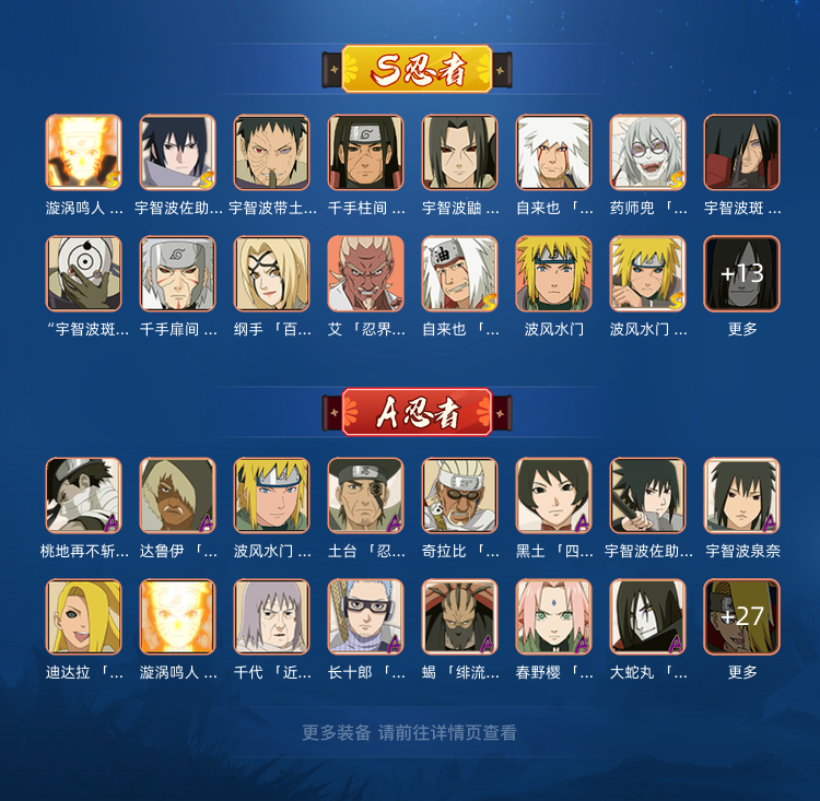 装备描述:136区 28S48A 忍战艾 忍战小李 九喇嘛鸣人 青年长门 死门凯 博人传达鲁伊 青年水门 秽土柱间 秽土鼬 仙人兜 秽土斑 千手柱间 秽土迪达拉 博人传木叶丸 秽土二代 百豪纲手 金鸣 秽土转生水门 神秘面具男 秽土转生三代 仙人鸣人 晓鼬忍战我爱罗 晓蛇百豪樱 神威卡卡西仙人鸣人 鹰水月宁次