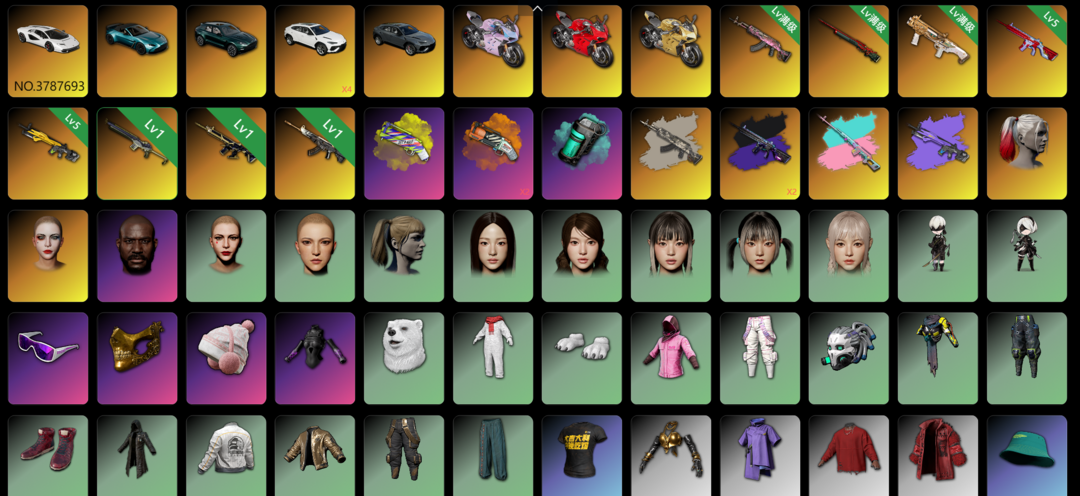 装备描述:布加迪红白双色/满兰博/满NewJeans女团/双马丁/3杜卡迪/满级异色火麒麟/满级孙悟空/满级DBS⑤异色无信号M4⑤异色小兔MK12/八戒M4/恶魔ACE/沙悟净MINI/时光加农sks/小丑女/3烟枪/双烟雾弹/滑雪镜/尼尔套/霓虹军团套/萨芬裤/悲喜套/拉风龙全套/白战神/魔力甜心全套/西游记全套/大量皮肤套装