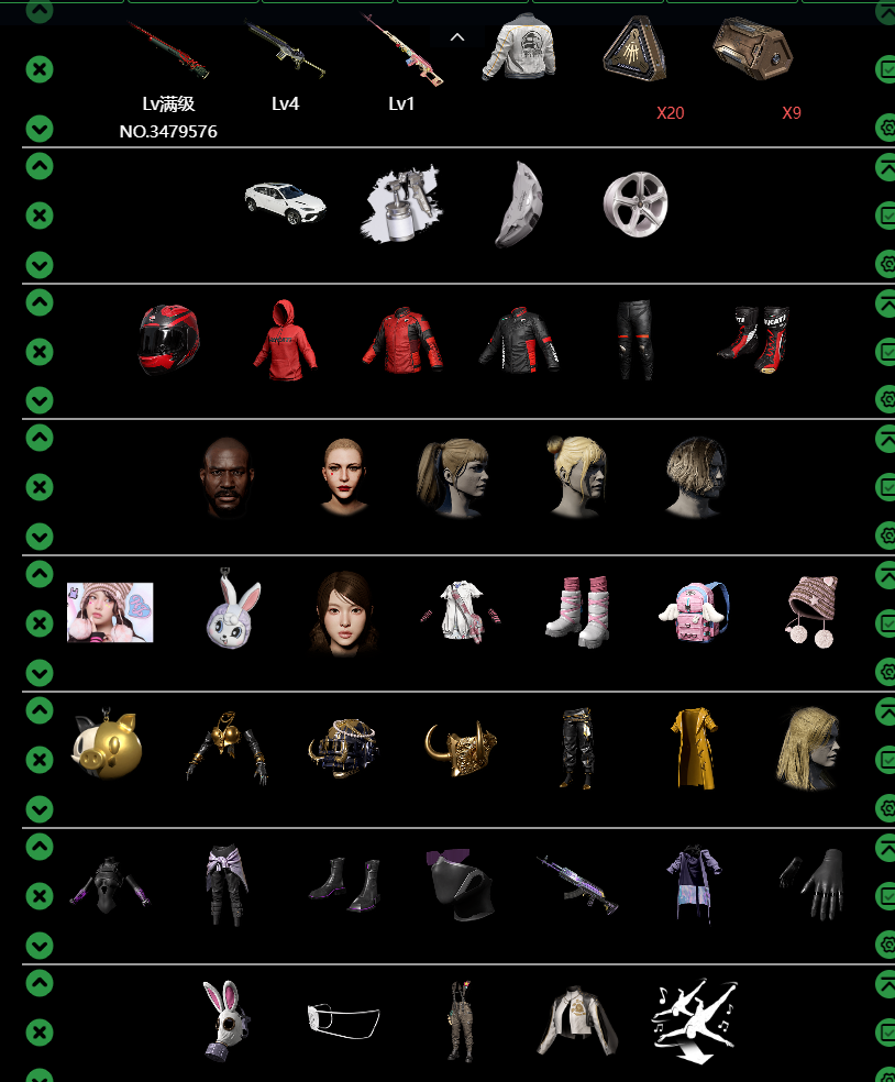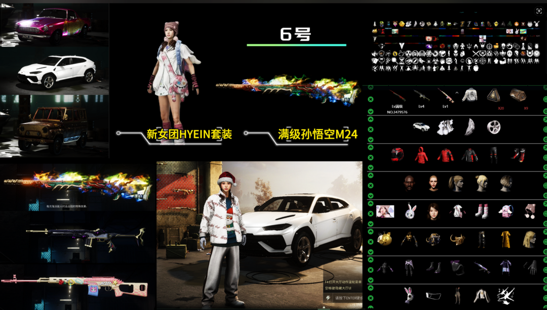 装备描述:兰博基尼SVU✨⑩孙悟空M24有淘汰特效/满级沙悟净MINI✨③异色妖魔之触ACE✨弥诺AUG✨无重力MP5K✨魔咒之力MK12✨粉梦德拉贡✨女团HYEIN套装✨猪八戒套装✨大量套装衣服/老黑鬼/发光套