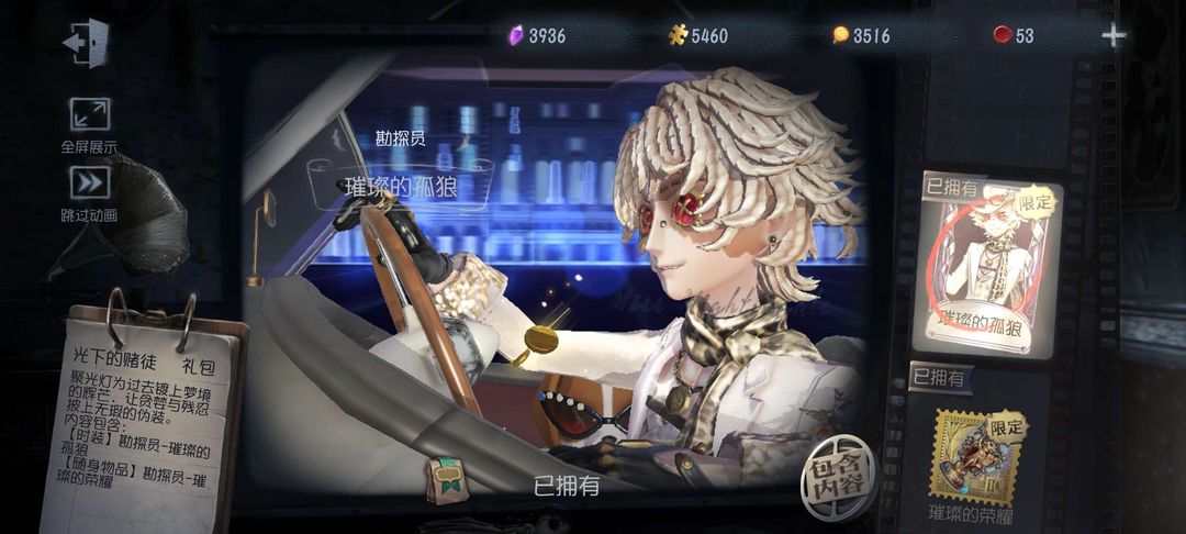 装备描述:石榴蝶 石榴碟小姐 柴郡猫 邪眼寄主 灾厄之主 限定 时之砂 限定“阿拉丁” 天海兰太郎 江户川乱步 放映厅 报纸怪客 锁芯 夜之商籁有金挂 新增拉拉队新年皮 筠心 新增 璀璨的孤狼+金挂
