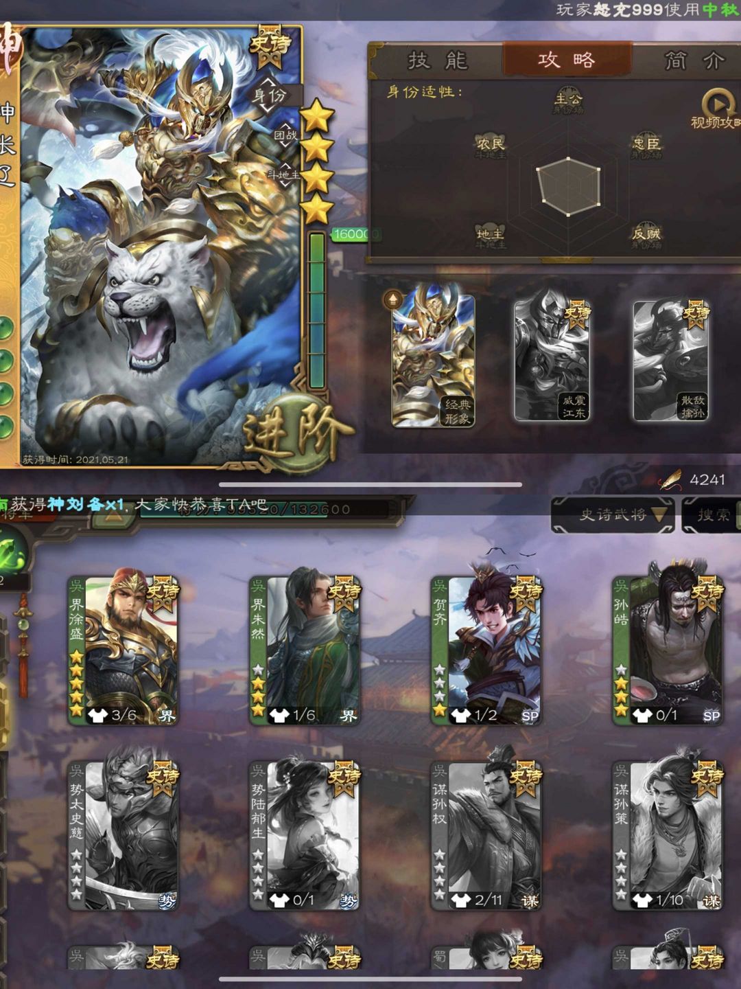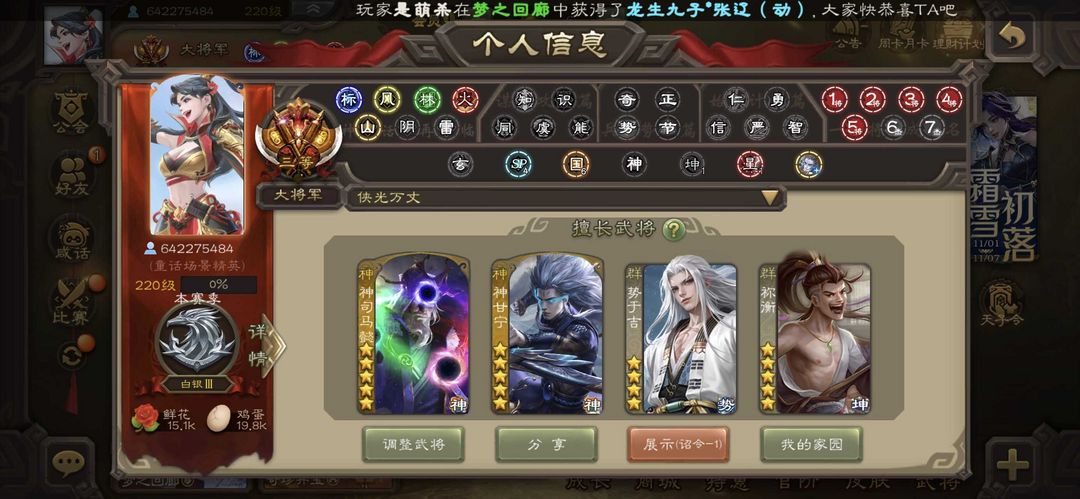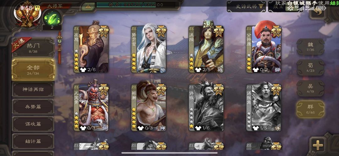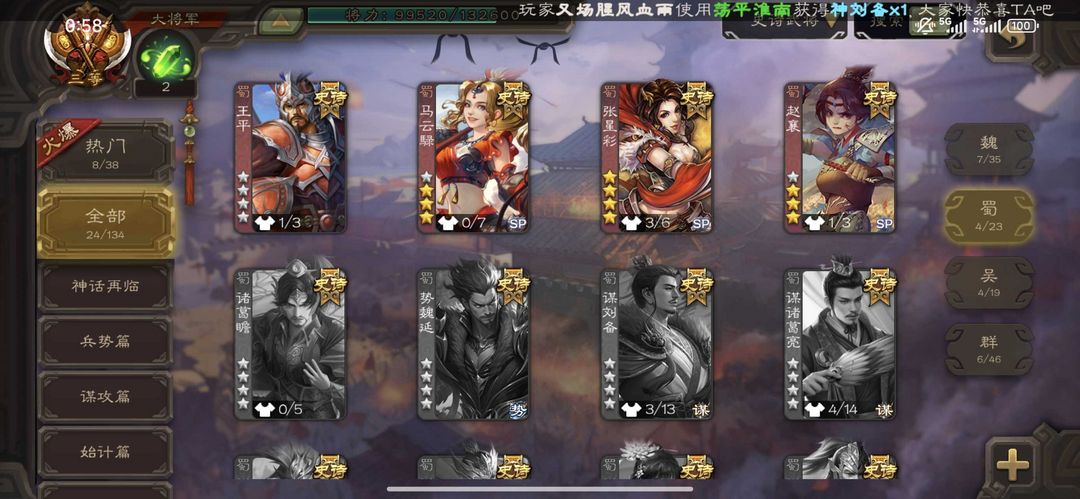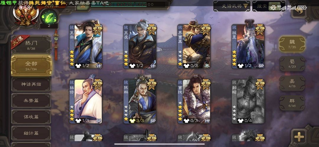 装备描述:大将军 有点将卡 势于吉 动神司马懿 动神甘宁 弥衡 界徐盛 王粲 王凌 曹纯 界朱然 神张辽 张星彩