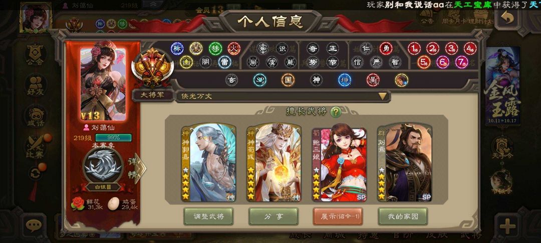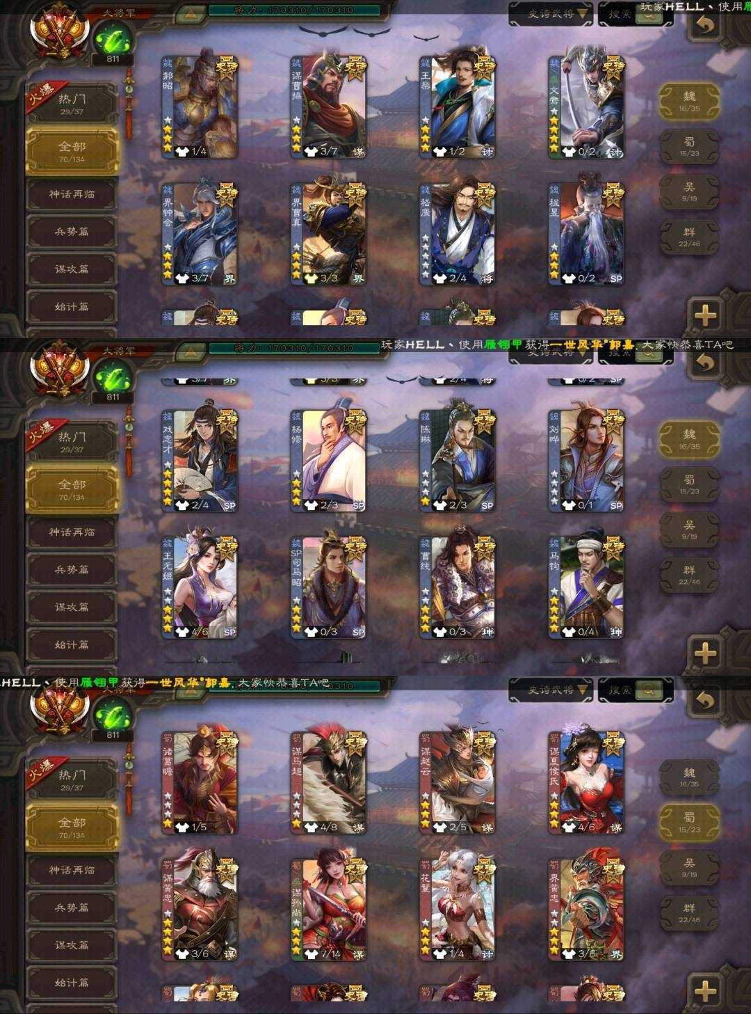 装备描述:一等大将军 VIP13 总数447 史诗70 动态皮肤65 魏国?郝昭?谋曹贼?王粲?文鸯?界钟会?界曹真?嵇康?程昱戏志才?杨修?陈琳?刘晔?王元姬?SP司马昭?曹纯?马钧? 蜀国?诸葛瞻?谋马超?谋赵云?谋夏侯氏?谋黄忠?谋孙尚香?花鬘?界黄忠?马云騄?张星彩?赵襄?关索?沙摩柯?鲍三娘?谯周? 吴国?谋孙尚香?骆统?周处?文鸯?界徐盛?界朱然?贺齐?留赞?孙寒华? 群雄?左慈?许攸?杜预?张仲景?皇甫嵩?界左慈?沮授?界李儒?张让?麹义?陶谦?士燮?司马徽?刘焉?苏飞?徐荣?公孙康?兀突骨?杨彪?祢衡?南华老仙?星黄忠? 神将?神郭嘉?神荀彧?神鲁肃?神孙策?神张辽?神太史慈?神甘宁?神刘备?神赵云?神吕布? 排位122 国战100